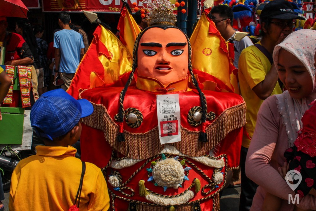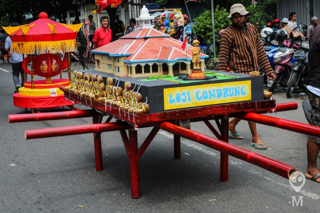 Gunungan yang di dalamnya berisi jajanan pasar, makanan ringan dan tak lupa kue keranjang khas imlek sebelumnya diarak keliling kawasan Kelurahan Sudiroprajan di ikuti pawai dari ragam kesenian Tionghoa dan Jawa. Beberapa diantaranya adalah Tarian Tradisional Jawa dan Kesenian Barongsai Tionghoa.