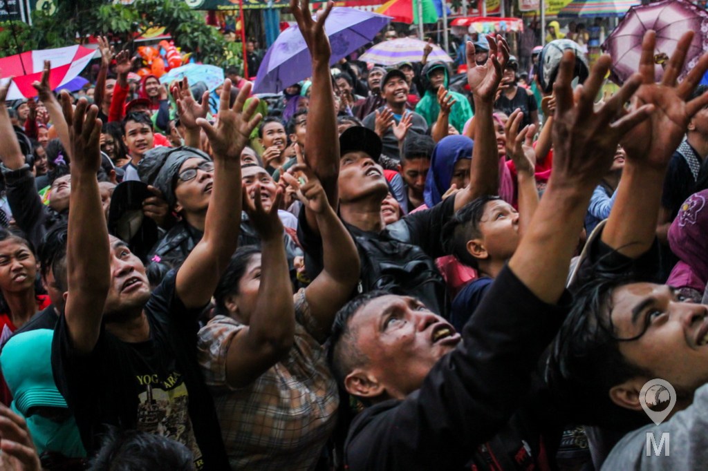 Guyuran hujan deras tak menyurutkan antusias masyarakat untuk berebut kue keranjang di kawasan Pasar Gede Solo masyarakat percaya dengan berebut kue keranjang yang berasal dari gunungan niscaya akan mendapatkan keberkahan di dalam kehidupan.