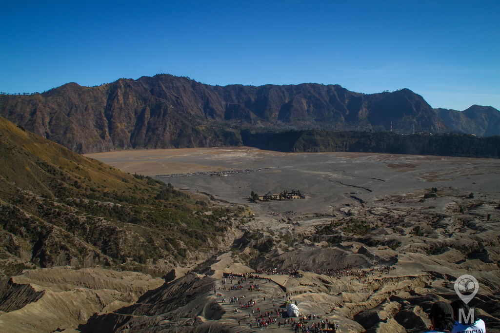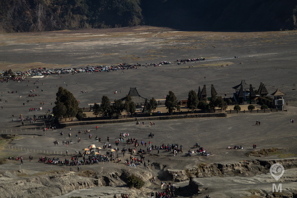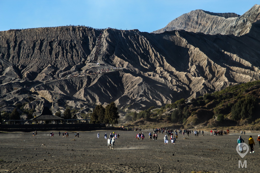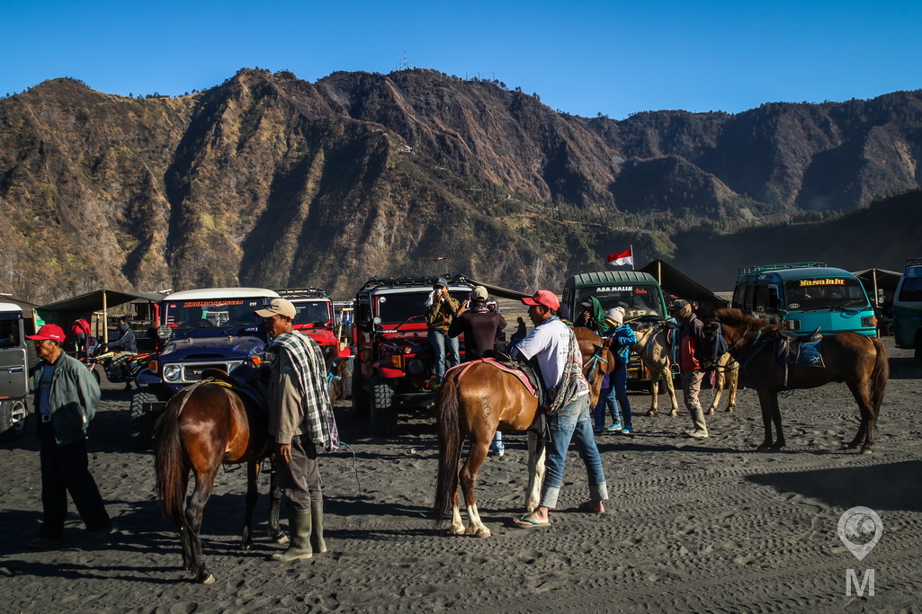 Perjalanan pun berlanjut jeep pun membawa saya turun menuju hamparan pasir atau turis mancanegara biasa menyebutnya ‘The Sea of sand’. Hamparan pasir yang luas menyambut pandangan mata saya setibanya di lokasi, Beberapa penunggang kuda pun menghampiri menawarkan jasanya untuk mengatar para wisatawan yang baru saja tiba menuju tangga pendakian agar dapat menikmati kawah dari bibir gunung bromo.